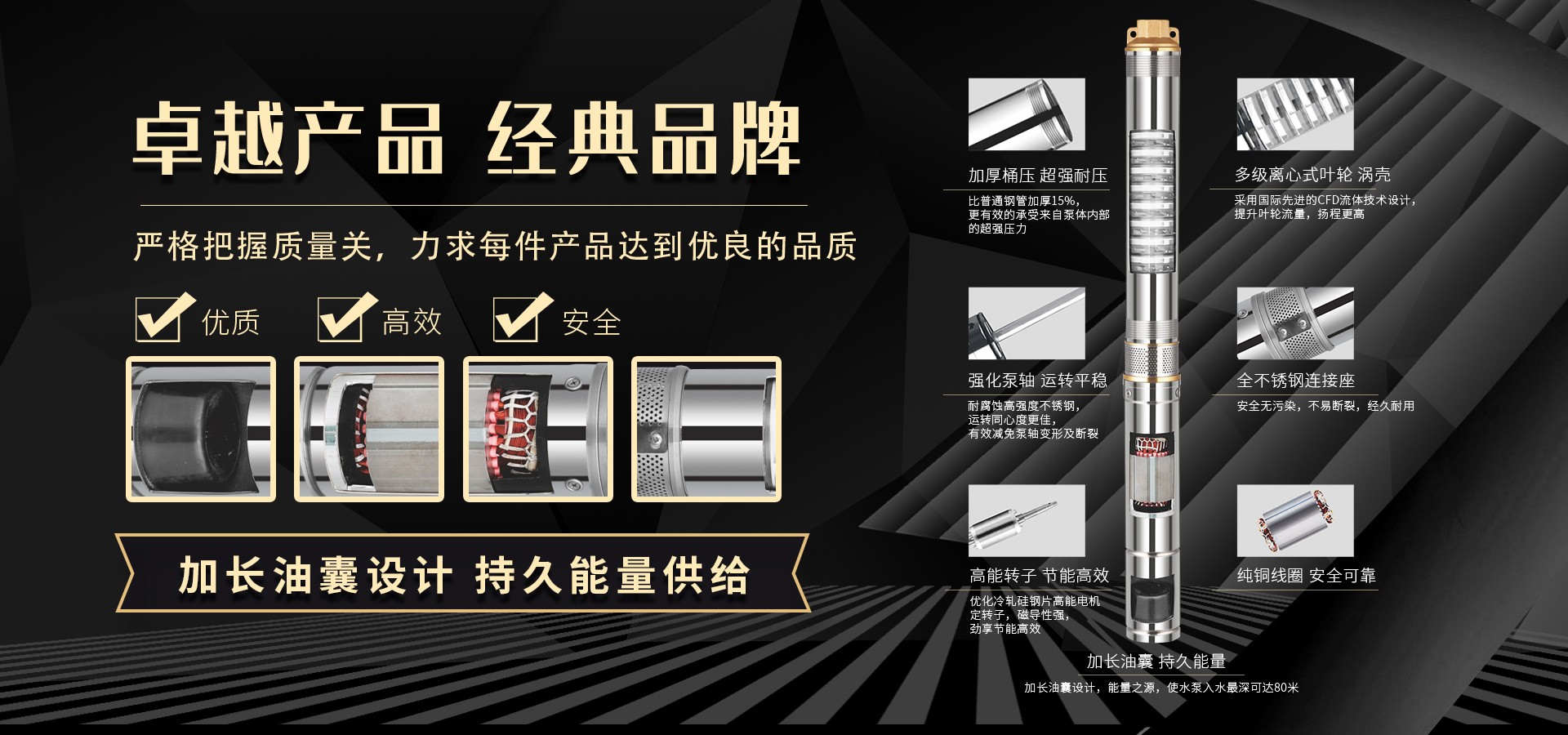 不僅僅是泵,更是流動的科技。十多年來,本公司堅持走:以質量求生存以科技創(chuàng)新求發(fā)展,重合同守信用的道路,生產經(jīng)營得到迅速發(fā)展。更希望以后不管從發(fā)達城市到新農村,從工業(yè)制造到尖端科技產業(yè)都隨處可見創(chuàng)江井泵的身影,創(chuàng)江深井泵已成為干萬用戶心目中優(yōu)質和信心的保證我們將以優(yōu)質的產品和最完善的售后服務來真誠與各界朋友開展廣泛的合作,共同創(chuàng)造一個美好的未來!